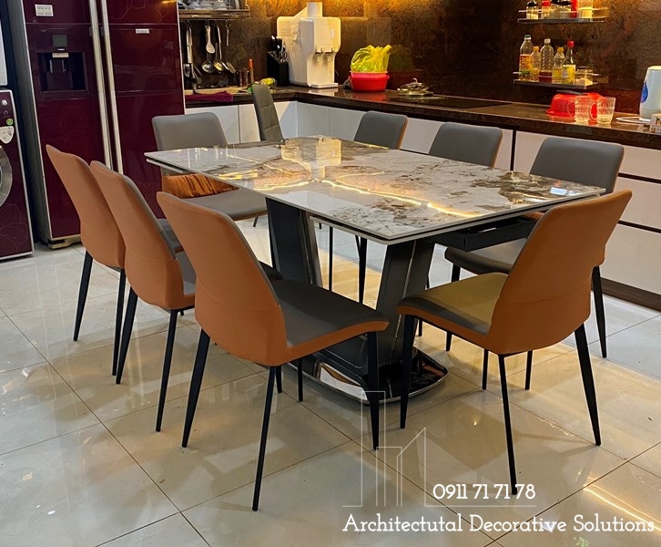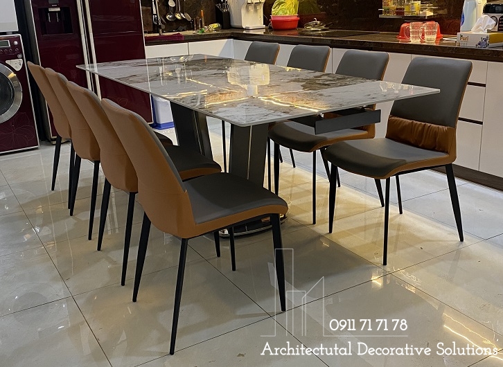 Bàn ăn sử dụng 2 chất liệu được ưu chuộng hiện hành là chân sắt và mặt đá cao cấp. Chất liệu này vừa mang đến phong cách hiện đại, vừa sang trọng lại dễ sử dụng và tuổi thọ cao. Bàn khi mở rộng ra có kích thước lên đến 2m5, rộng rãi vừa vặn bộ 8 ghế ăn.