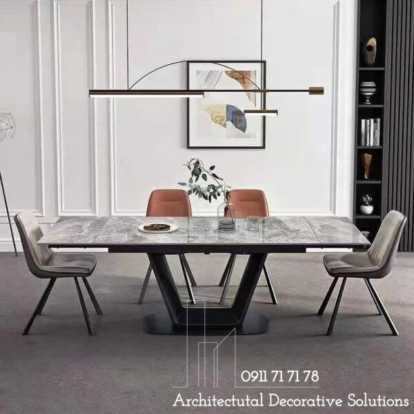 Bàn ăn sử dụng 2 chất liệu được ưu chuộng hiện hành là chân sắt và mặt đá cao cấp. Chất liệu này vừa mang đến phong cách hiện đại, vừa sang trọng lại dễ sử dụng và tuổi thọ cao. Phần chân bàn được thiết kế độc đáo, mặt đá sử dụng đá nhập cao cấp chống thấm dễ dàng lau chùi, vân đá cực kỳ sang trọng và hiện đại.