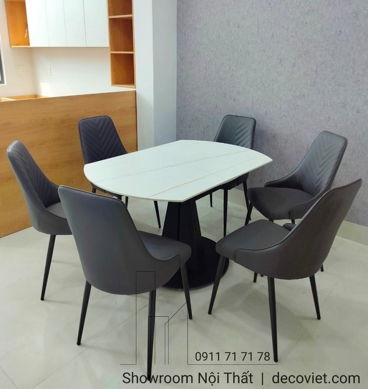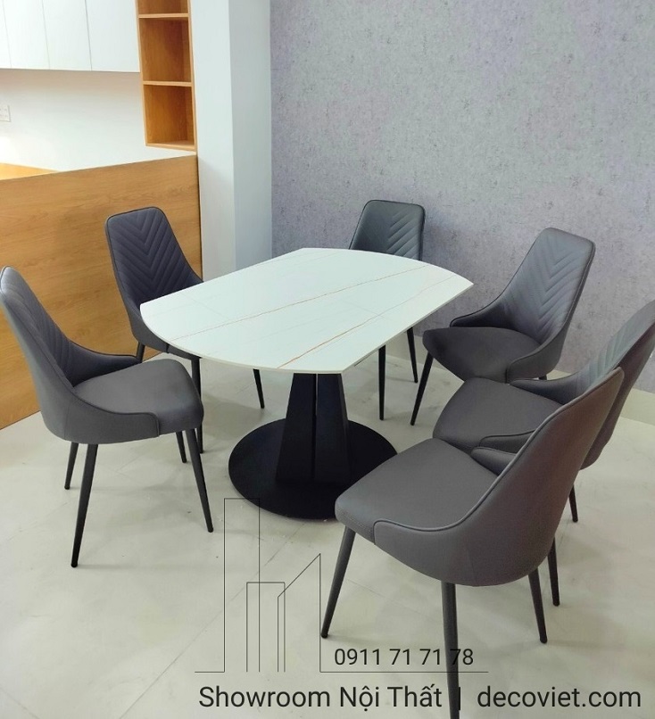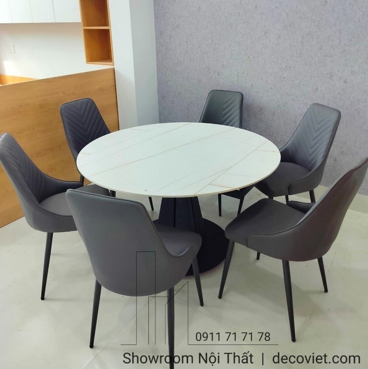 Với chất liệu mặt đá nhân tạo cao cấp có phủ creramic tăng khả năng chống thấm, chống ố, chống xước mang đến trải nghiệm tiện ích cho người sử dụng. Phần chân bàn được tạo hình tinh tế, độc đáo đầy lôi cuốn. Bàn ăn với đường kính rộng rãi, có thể sắp xếp được từ 4-6 đến ghế ăn, phù hợp với gia đình nhiều thành viên hoặc gia đình hay có khách ghé thăm. Bộ ghế ăn với thiết kế sang trọng, màu sắc hài hòa với bàn ăn sẽ tạo nên điểm nhấn cho gian bếp của bạn.
