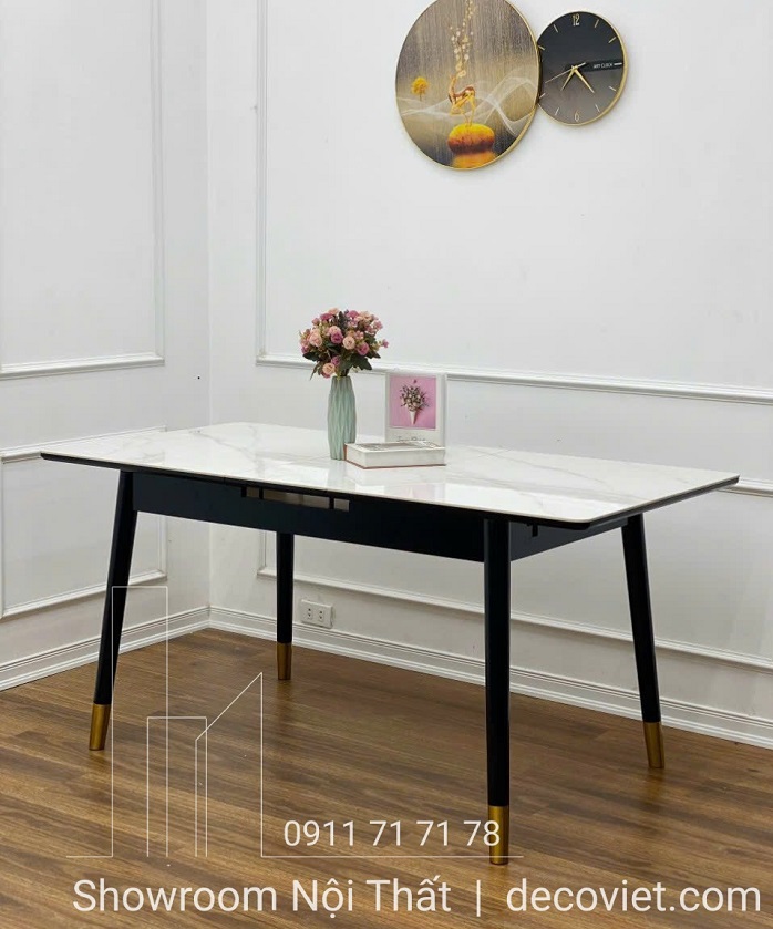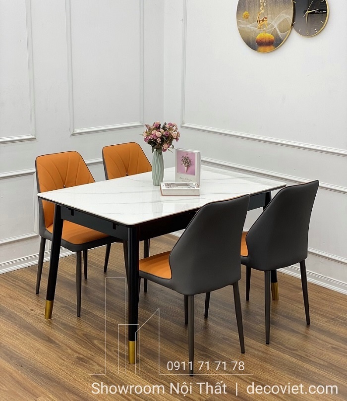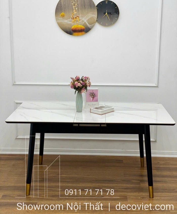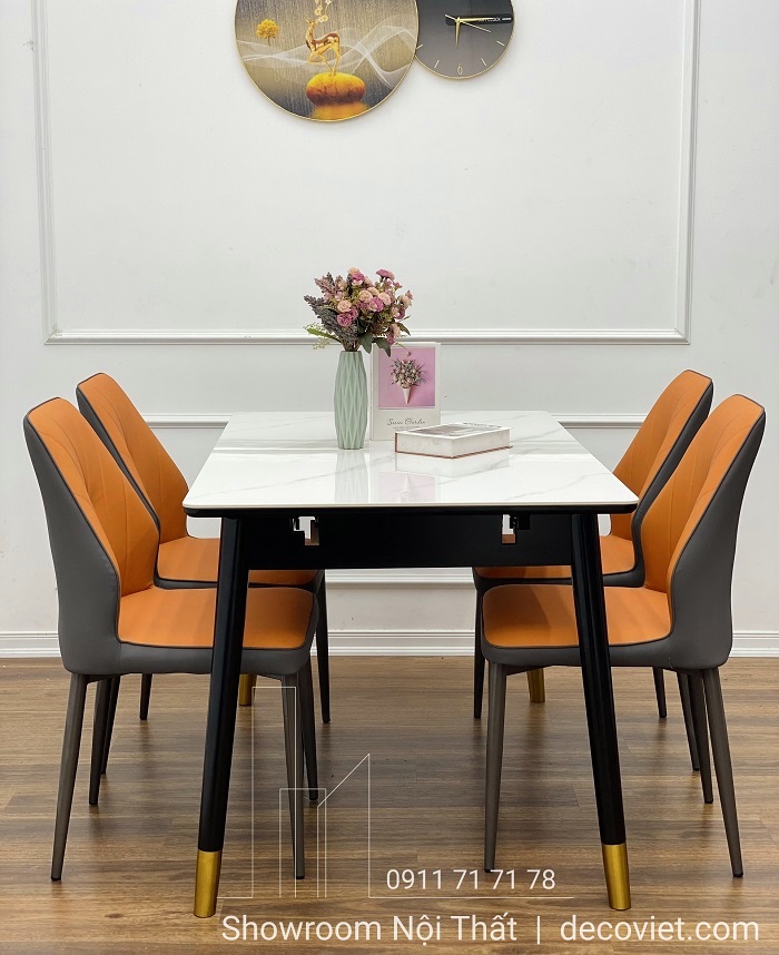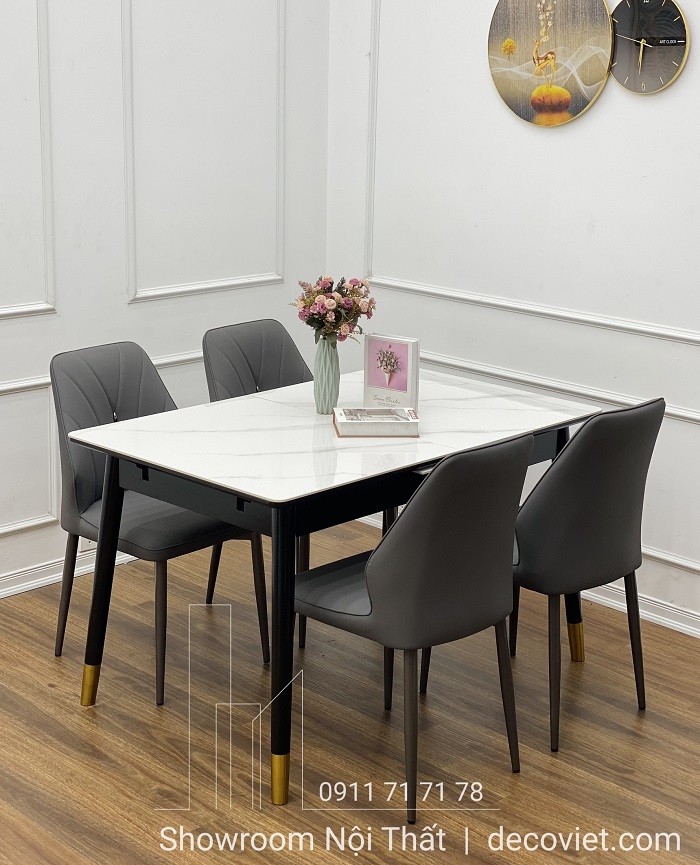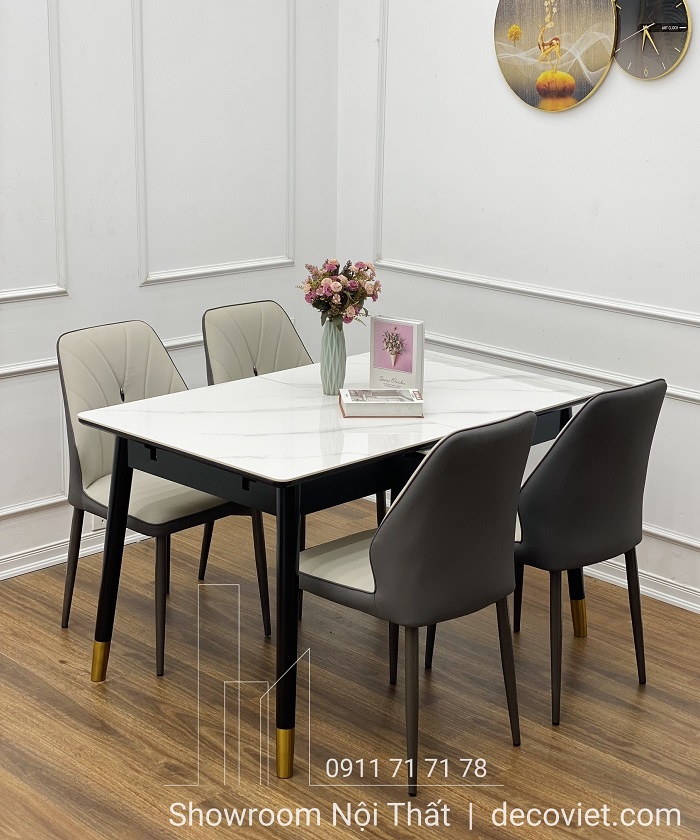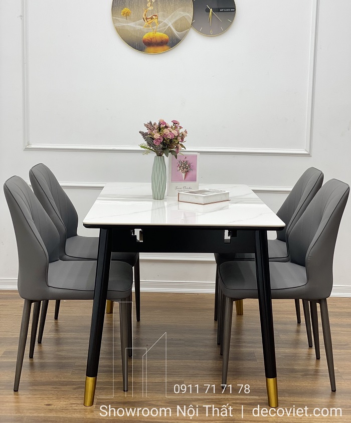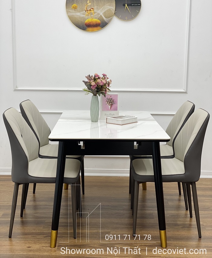 Bàn ăn kéo dài thông minh được coi là "vị cứu tinh" đối với những không gian phòng bếp có diện tích khiêm tốn. Với cơ chế kéo dài và gấp gọn linh hoạt, các mẫu bàn ăn kéo dài mặt đá mang đến sự sang trọng trong thiết kế cũng như những trải nghiệm tuyệt vời trong quá trình sử dụng. Bộ Bàn Ăn Kéo Dài 4 Ghế 1417S mà DecoViet giới thiệu đến bạn sau đây có thiết kế đẹp mắt, hợp xu hướng cùng tính năng thông minh, mở rộng và thu gọn mặt bàn nhanh chóng, đáp ứng nhu cầu về thẩm mỹ cũng như mục đích sử dụng.
