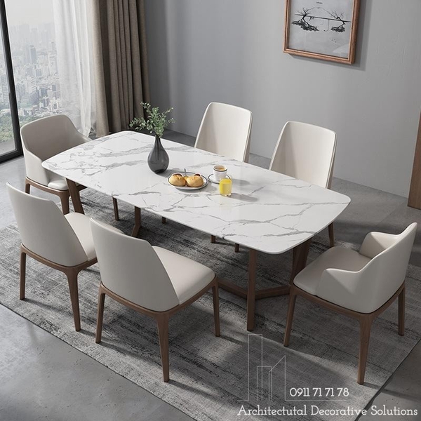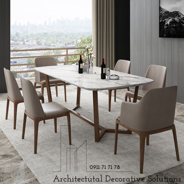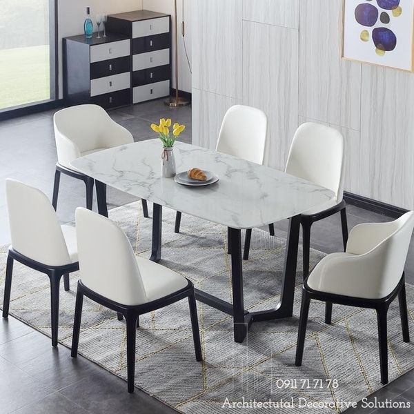 Chất Liệu : bàn chân gỗ tự nhiên mặt đá trắng vân, ghế ăn bọc da cao cấp.