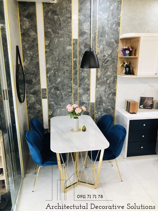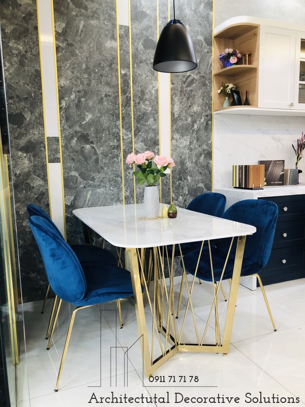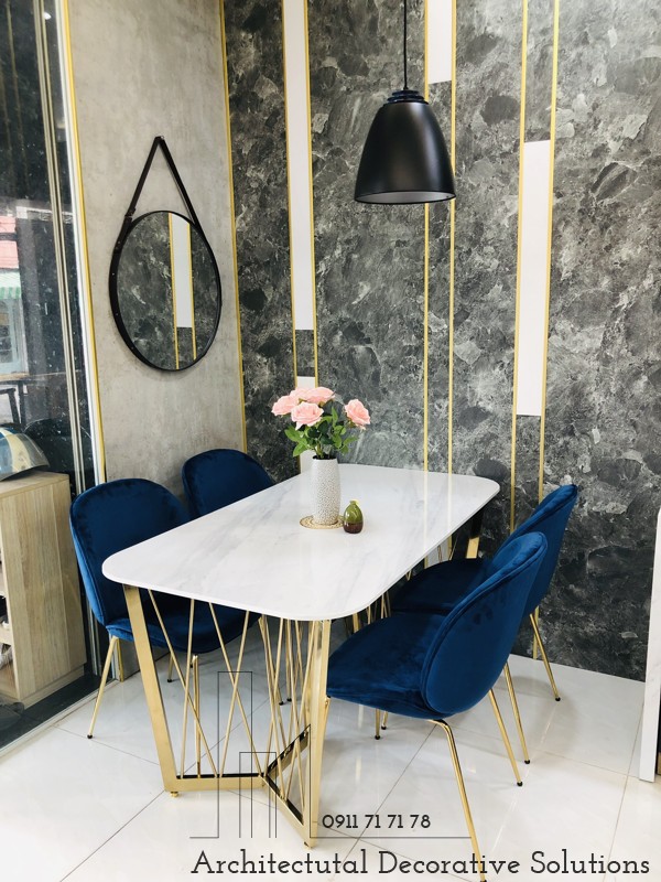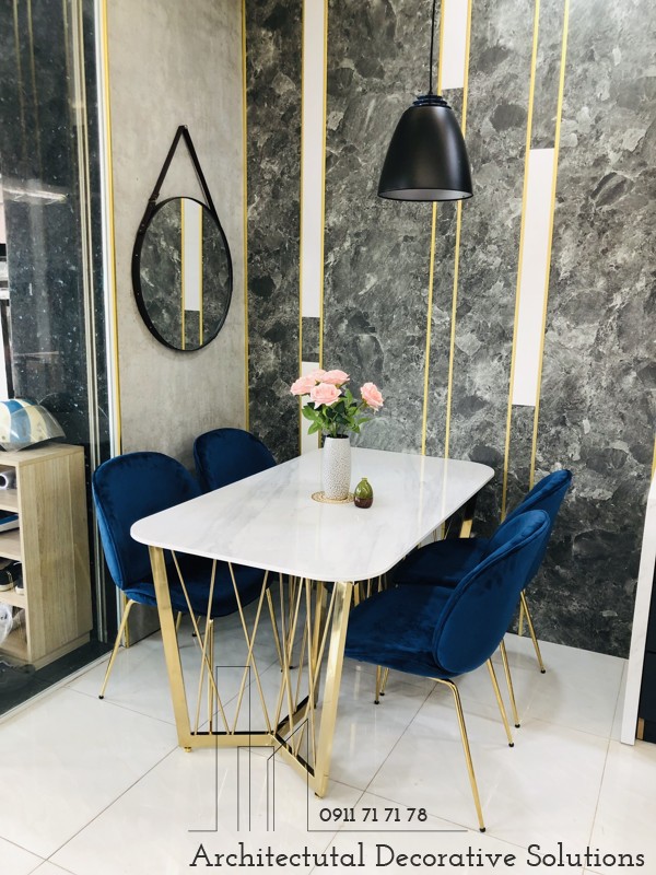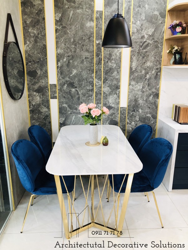 Chất Liệu : 4 ghế bọc vải chân sắt si, bàn mặt đá chân inox..