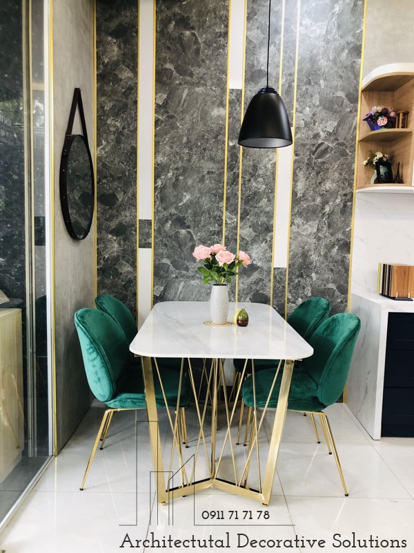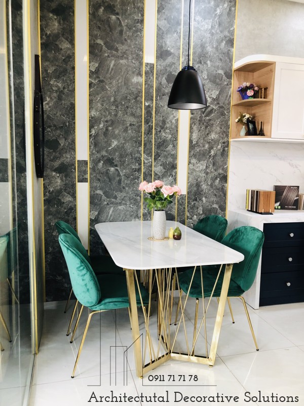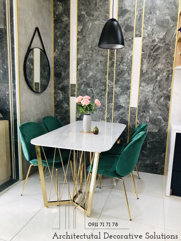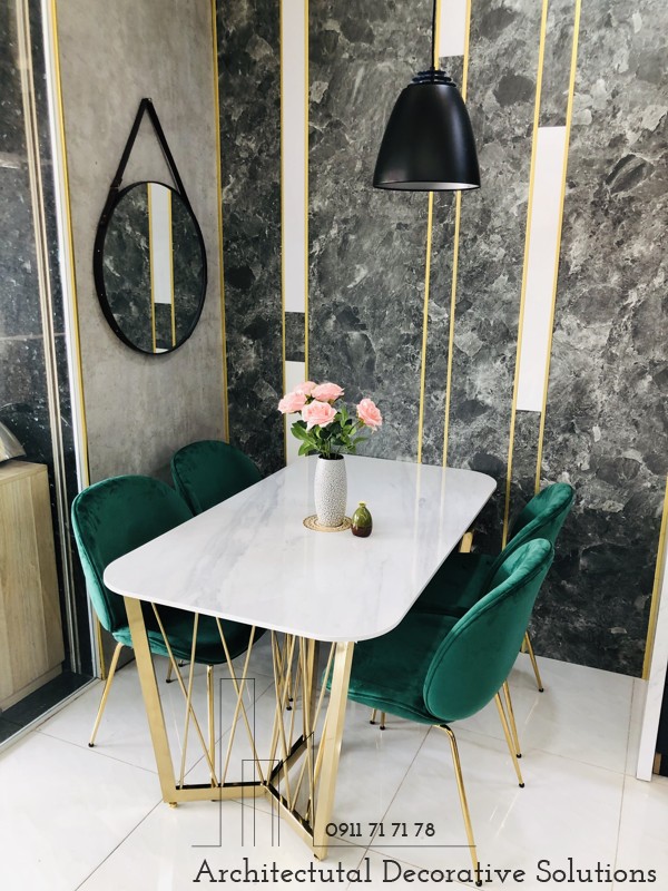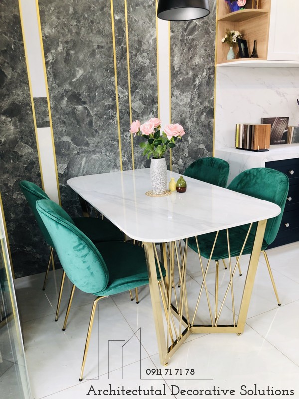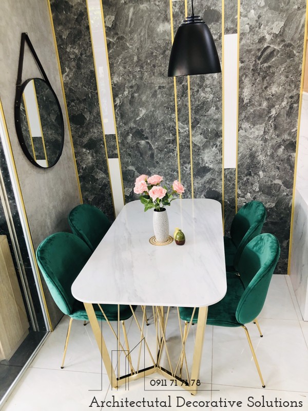 Chất Liệu : 4 ghế bọc vải chân sắt si, bàn mặt đá chân inox..