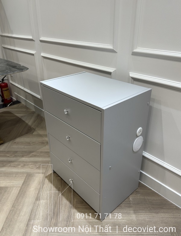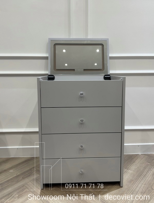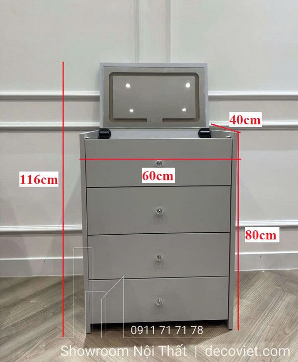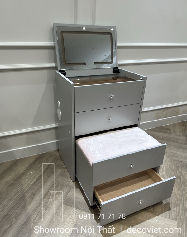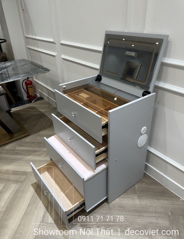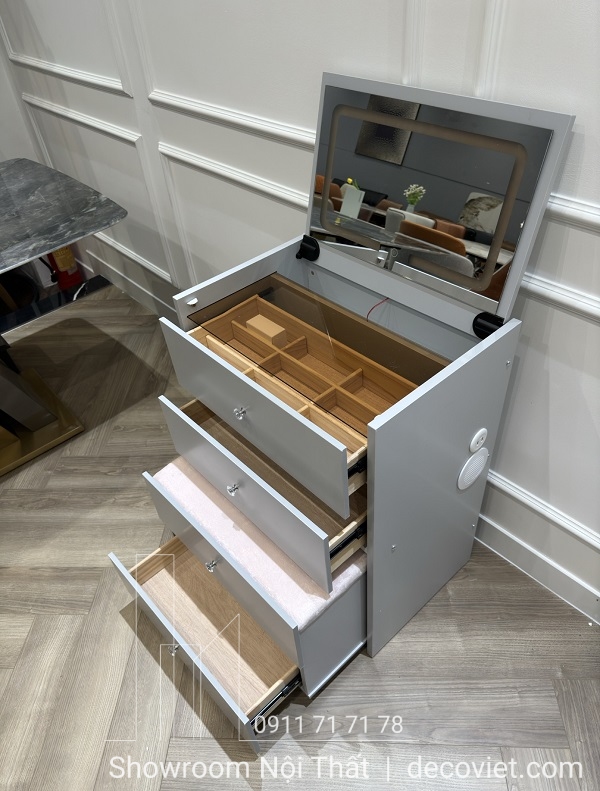 - Các hộc tủ rộng rãi, chắc chắn được trang bị ray trượt mượt mà, phù hợp để cất giữ các lọ mỹ phẩm, son, phấn, nước hoa cũng như phụ kiện.