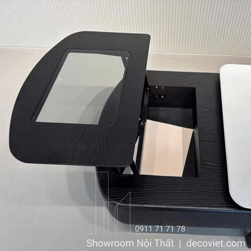 Bàn trà phòng khách thiết kế thông minh gồm nhiều phần chức năng khác nhau, vừa có mặt bàn chính rộng rãi, vừa có phần mặt bàn phụ có thể nâng hạ linh hoạt, tạo sự tiện lợi trong sinh hoạt hằng ngày. Kiểu dáng gọn gàng, đường nét tinh tế giúp bàn dễ dàng kết hợp với nhiều không gian nội thất, mang đến sự sang trọng và tiện nghi cho phòng khách.