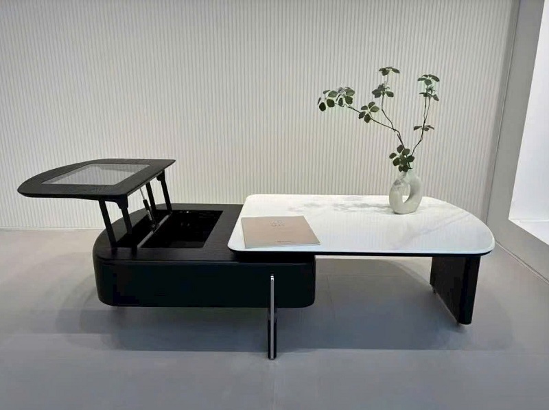 Điểm đặc biệt của mẫu bàn sofa thông minh chính là mặt bàn có thể nâng hạ linh hoạt, biến hóa nhanh chóng từ bàn trà tiếp khách thành bàn làm việc hoặc bàn ăn nhẹ. Ngoài ra, chiếc bàn còn có thể thu gọn đơn giản, giúp tiết kiệm diện tích tối đa, đặc biệt phù hợp với những căn hộ chung cư hiện đại. Ngoài ra, phần hộc chứa đồ được bố trí khéo léo bên dưới, mang lại không gian lưu trữ gọn gàng cho sách báo, remote, hay vật dụng nhỏ.