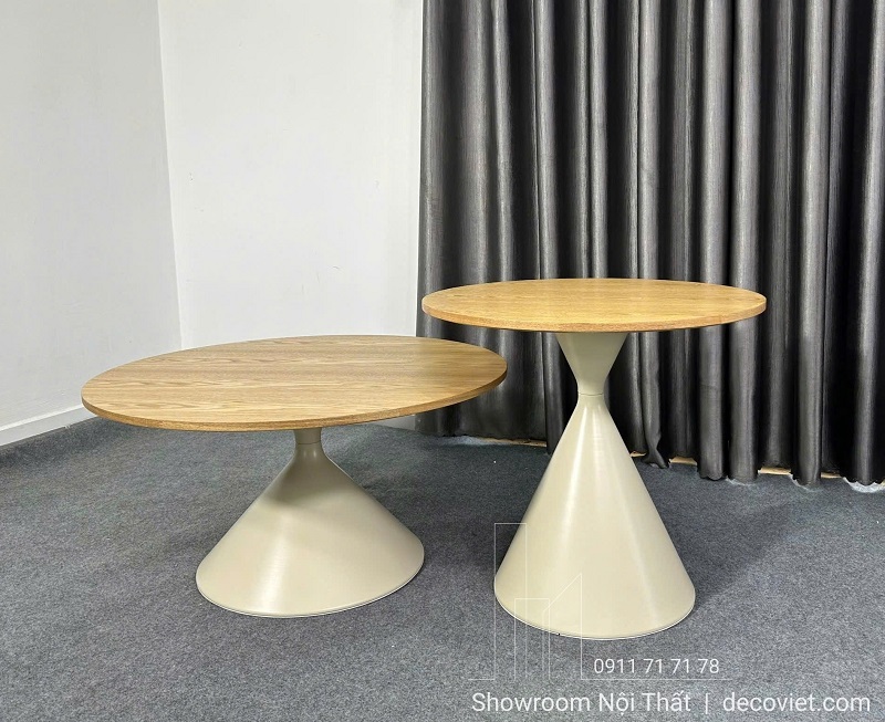 Mặt bàn gỗ sáng màu kết hợp cùng phần chân sơn trắng dáng loe tạo nên tổng thể rất hài hòa, hiện đại nhưng không lạnh. Kiểu dáng này dễ phối với sofa vải, sofa nỉ hay sofa màu sáng, rất hợp với phong cách Bắc Âu, tối giản hoặc Japandi. Không quá cầu kỳ về chi tiết, nhưng chính sự tinh giản đó lại giúp bộ bàn trà bền dáng, dễ nhìn và không bị lỗi mốt theo thời gian.