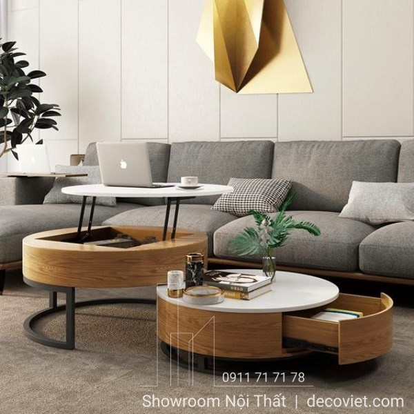 + Kiểu dáng bàn trà: Mẫu bàn trà tròn đôi thiết kế hiện đại gồm 1 bàn lớn và 1 bàn nhỏ khác nhau về chiều cao. Mặt bàn trà lớn có thể nâng hạ linh hoạt, dưới mặt bàn là một không gian lưu trữ nhỏ vô cùng tinh tế.