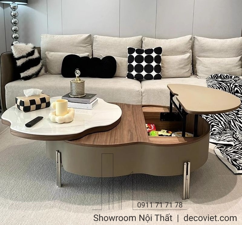 Không cần quá nhiều chi tiết cầu kỳ, chiếc Bàn Trà Gỗ Mặt Đá 418S đủ sức khiến người ta dừng lại thật lâu chỉ để ngắm nhìn. Tựa như một cánh hoa lặng lẽ bung nở, thiết kế bo cong mềm mại cùng hai mặt bàn đan xen gỗ và đá mang lại cảm giác vừa dịu dàng, vừa sang trọng. Nhưng đằng sau vẻ đẹp ấy là cả một hệ thống công năng thông minh: mặt bàn đá có thể xoay tròn mở rộng, mặt phụ nâng hạ tiện lợi, ngăn chứa đồ và hộc kéo nhỏ ẩn bên trong – tất cả đều phục vụ cho một không gian sống gọn gàng, tinh tế và đầy cảm hứng.