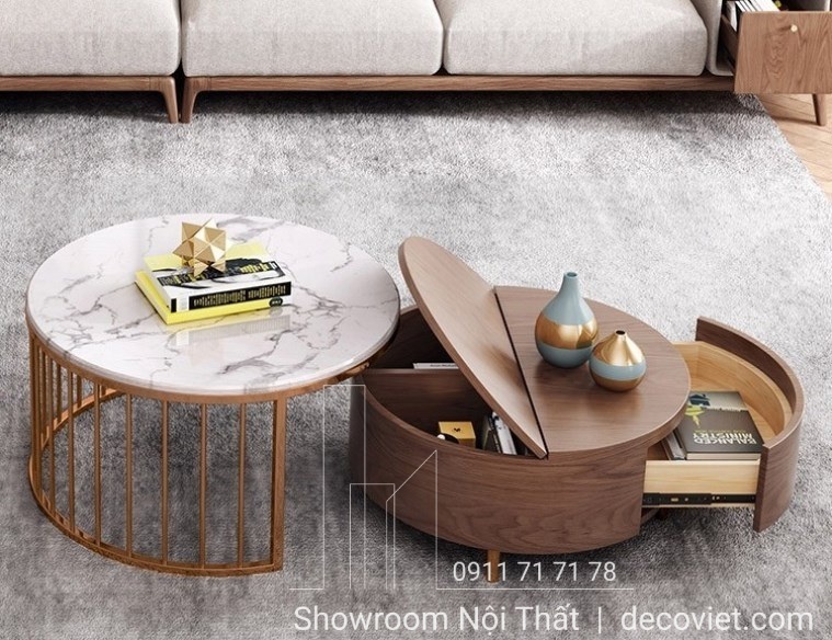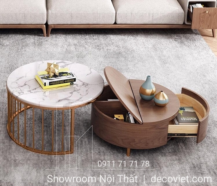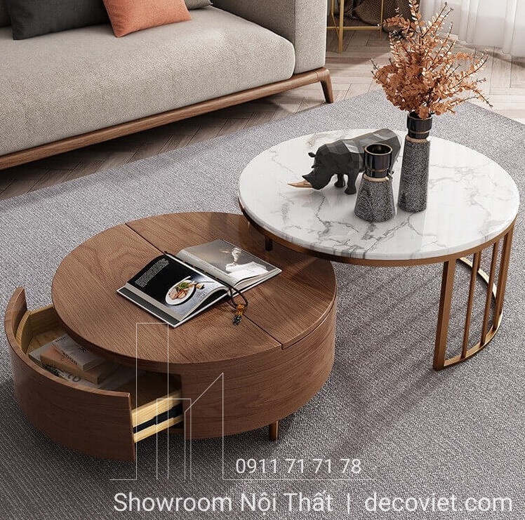 + Kiểu dáng bàn trà: Mẫu bàn trà tròn đôi thiết kế hiện đại gồm 1 bàn lớn và 1 bàn nhỏ khác nhau về chiều cao. Mặt bàn trà gỗ nhỏ còn có thể gập mở để mở ra không gian lưu trữ phía dưới mặt bàn vô cùng tiện ích, bên cạnh là hộc kéo rộng rãi giúp bạn cất giữ các món đồ cá nhân.