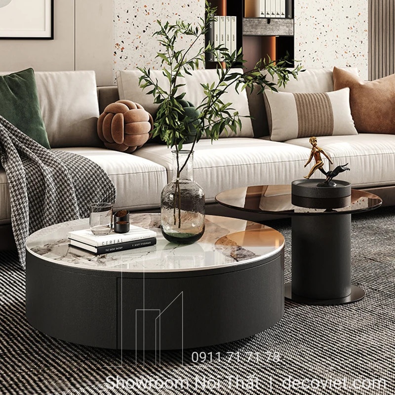 + Kiểu dáng bàn trà: Mẫu bàn trà tròn đôi thiết kế hiện đại gồm 1 bàn lớn và 1 bàn nhỏ khác nhau về chiều cao và kích thước. Bàn trà lớn có chiều cao thấp hơn bàn trà nhỏ, giúp chúng có thể lồng ghép vào nhau một cách tinh tế. Thiết kế bàn sofa giá rẻ còn tích hợp 2 hộc kéo nhỏ xinh, giúp bạn có thể cất giữ đồ vật một cách dễ dàng và tiện nghi.