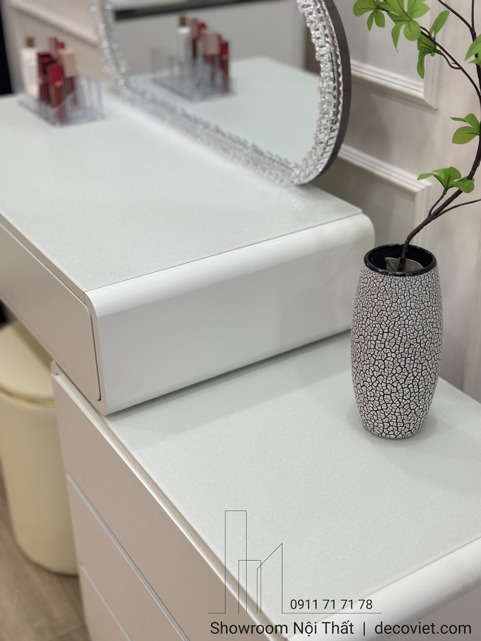 Bàn phấn trang điểm được làm từ gỗ MDF sơn phủ cao cấp, bề mặt nhẵn mịn dễ vệ sinh. Các ngăn kéo trượt nhẹ nhàng, rộng rãi, giúp lưu trữ mỹ phẩm, nước hoa hay phụ kiện ngăn nắp, dễ tìm.