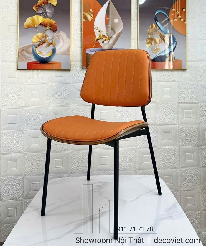Điểm nổi bật của chiếc ghế ăn này nằm ở cấu trúc kết hợp ba chất liệu cao cấp: phần lưng ghế được uốn cong từ gỗ tạo cảm giác ôm lưng thoải mái, lớp nệm bọc da mang lại sự êm ái và dễ lau chùi, trong khi khung chân sắt phủ sơn tĩnh điện giúp tăng độ chắc chắn và độ bền theo thời gian. Tất cả tạo nên một tổng thể hài hòa, mạnh mẽ nhưng vẫn rất thanh lịch.