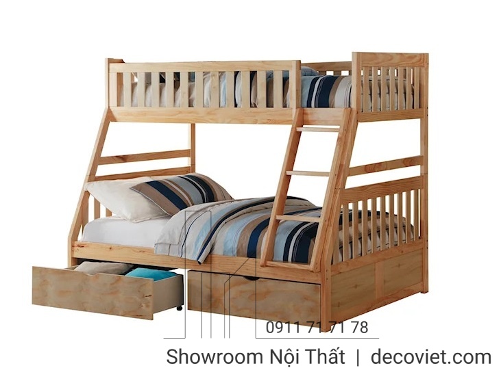 Giường 2 tầng giá rẻ cho bé được sản xuất bằng gỗ thông được nhập khẩu 100% từ New Zealand đã qua xử lý chống cong vênh, mối mọt và chống hút ẩm. Đặc biệt, giường 2 tầng còn được thiết kế 2 ngăn kéo ở dưới giúp tạo nhiều không gian hơn để cất giữ đồ dùng.