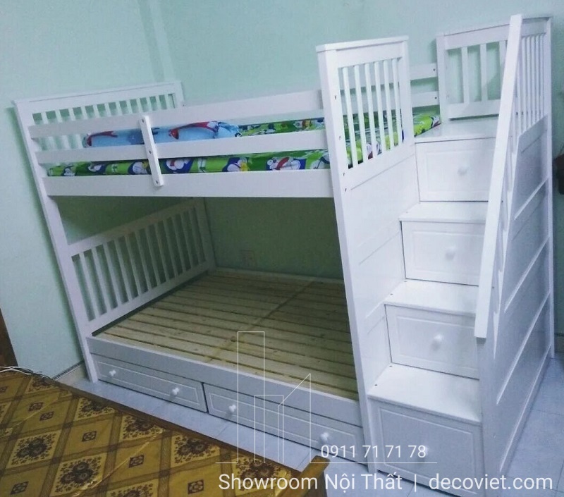 • Chiếc giường có kết cấu 2 tầng chắc chắn, làm từ chất liệu gỗ thôngcao cấp, bậc thềm đi lên thiết kế dạng khối hộp kết hợp ngăn đựng đồ tiện ích cho gia đình.
