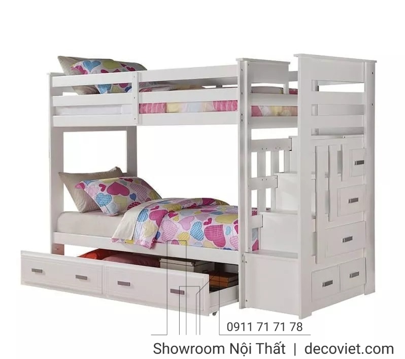 Giường tầng đang là một sản phẩm được nhiều gia đình yêu thích bởi sự tiện ích, thông minh và thẩm mỹ. Các mẫu giường tầng cho bé tại DecoViet luôn đảm bảo độ bền chắc cũng như tạo được không gian sống nhỏ gọn và khoa học. Giường 3 Tầng 404T với thiết kế tinh tế, ấn tượng và đẹp mắt, chất liệu gỗ thông bền đẹp cùng tiêu chuẩn xuất khẩu châu Âu. Mẫu giường tầng giá rẻ này còn được tích hợp nhiều ngăn kéo lưu trữ, giúp tăng thêm không gian lưu trữ đồ đạc, tăng tính thẩm mỹ cho không gian căn phòng.