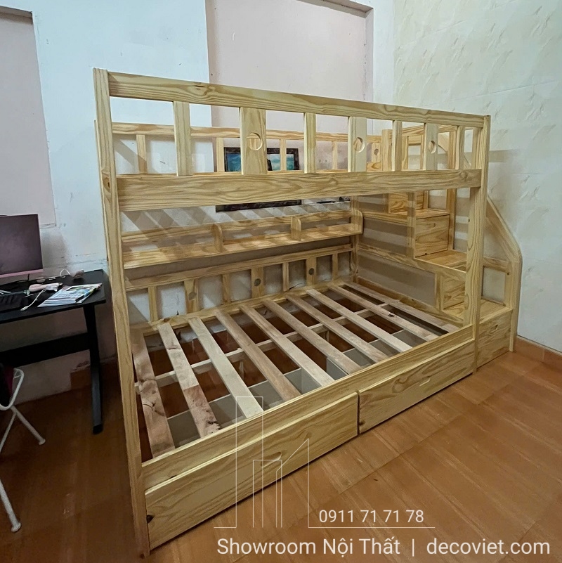Giường Tầng 437T được thiết kế đẹp với các họa tiết trang trí. Thiết kế tối ưu để tiết kiệm diện tích phòng ngủ, sử dụng cho cả trẻ em và người lớn. Ưu điểm lớn của loại giường này là rộng rãi, dùng cho 2-3 người cả trẻ em và người lớn với 2 giường, tầng trên rộng 1m4, tầng dưới rộng 1m. Phía dưới tầng 1 là các hộc kéo dùng để chứa đồ, cầu thang chắc chắn.