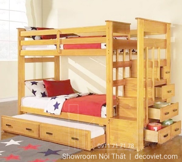 • Mẫu giường tầng gỗ có kết cấu 3 tầng chắc chắn, bậc thềm đi lên thiết kế dạng khối hộp kết hợp ngăn đựng đồ tiện ích cho gia đình.