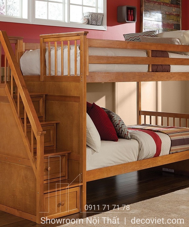 Các mẫu giường 2 tầng đang được nhiều người sử dụng bởi sự tiện ích, nhỏ gọn và thông minh. Các mẫu giường tầng cho người lớn, giường tầng trẻ em tại DecoViet luôn đảm bảo độ bền chắc cũng như tạo được không gian sống nhỏ gọn và khoa học. Mẫu Giường Tầng 2T – Vàng với thiết kế tinh tế, ấn tượng và đẹp mắt, chất liệu gỗ thông bền đẹp cùng tiêu chuẩn xuất khẩu châu Âu. Mẫu giường tầng gỗ này còn được tích hợp thêm các hộc kéo ở các bậc cầu thang, giúp tăng thêm không gian lưu trữ đồ đạc, tăng tính thẩm mỹ cho không gian căn phòng.