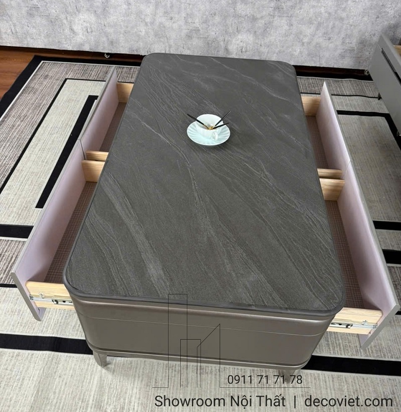 Bên dưới mặt bàn là ngăn kéo âm rộng rãi, rất tiện lợi để lưu trữ điều khiển, sách, khay trà hoặc phụ kiện trang trí nhỏ. Tay nắm thiết kế ẩn giúp tổng thể bàn thêm phần tối giản nhưng không kém phần tinh tế.