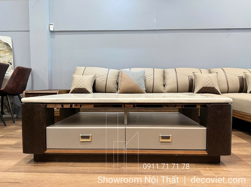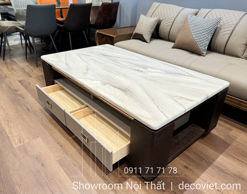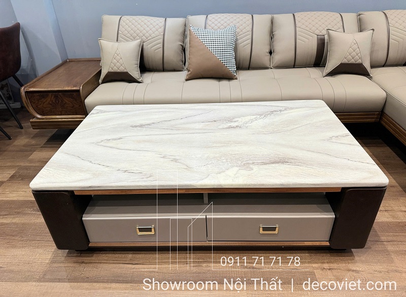 Bên cạnh đó, bàn trà sẽ là nơi để bạn thưởng thức cà phê khi thư giãn, xem tivi hoặc là nơi bày trí dĩa hoa quả, bánh kẹo để đón tiếp khách. Với thiết kế bàn trà mặt đá đẹp hiện đại, diện tích mặt bàn rộng rãi, hộc kéo rộng rãi với ray trượt mượt mà, tạo nên một không gian phòng khách thoải mái, tiện nghi và đầy phong cách.