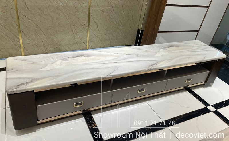 Mẫu kệ tivi mặt đá hiện đại sẽ giúp bạn sắp xếp gọn gàng các thiết bị điện tử, như tivi, đầu đĩa, loa, hay các món đồ trang trí, đảm bảo không gian phòng khách luôn ngăn nắp và sạch sẽ. Các ngăn kéo và kệ mở của kệ tivi cao cấp không chỉ cung cấp chỗ để lưu trữ các vật dụng một cách tiện lợi mà còn giúp bạn dễ dàng tìm thấy khi cần.