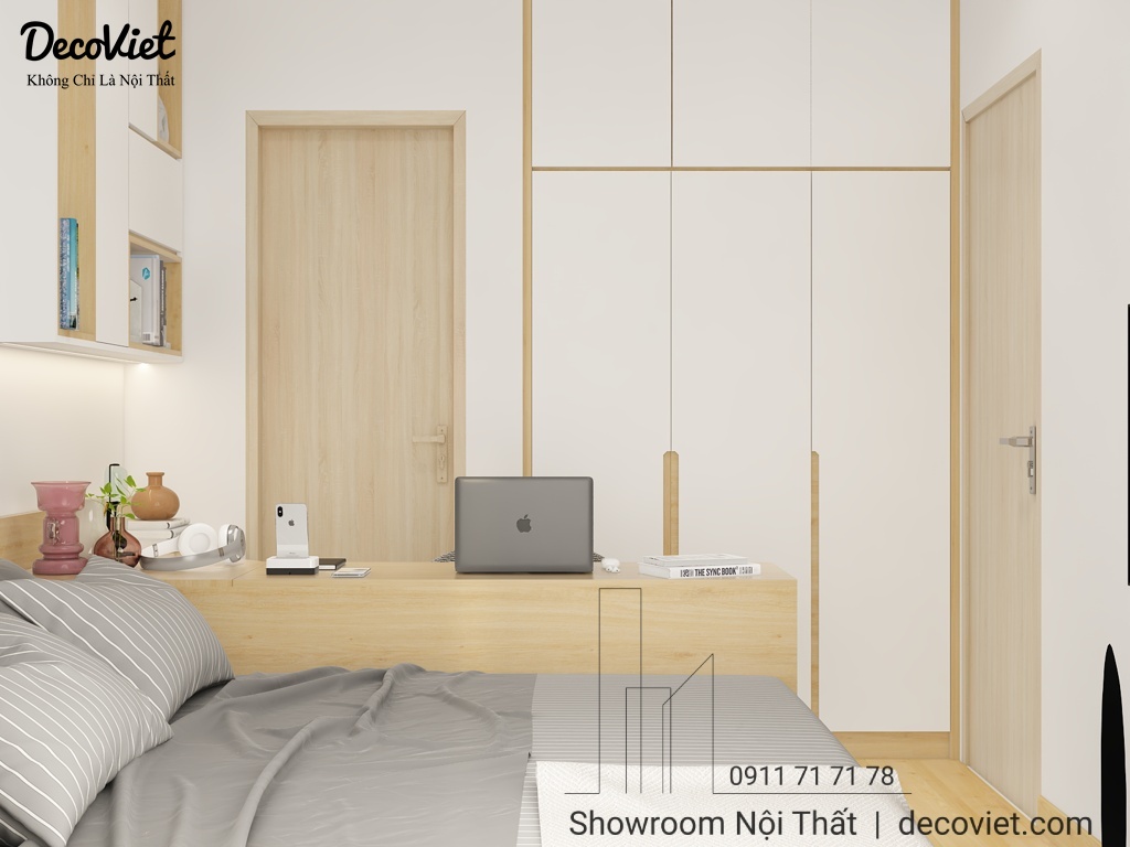 Thiết kế loại bỏ kệ tivi như truyền thống, giúp bạn có khoảng không gian đi lại thoải mái mà vẫn đảm bảo vẻ đẹp thẩm mỹ cho phòng ngủ.
