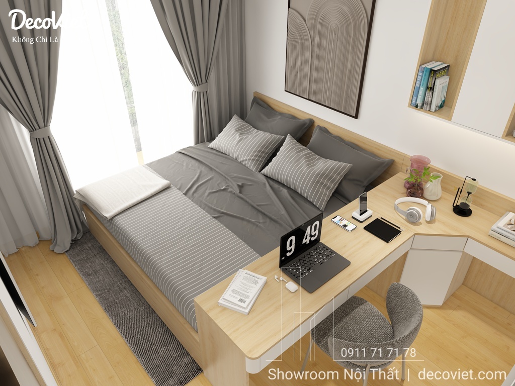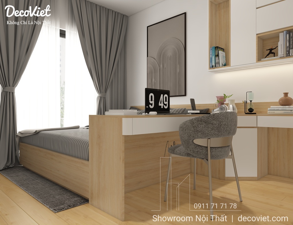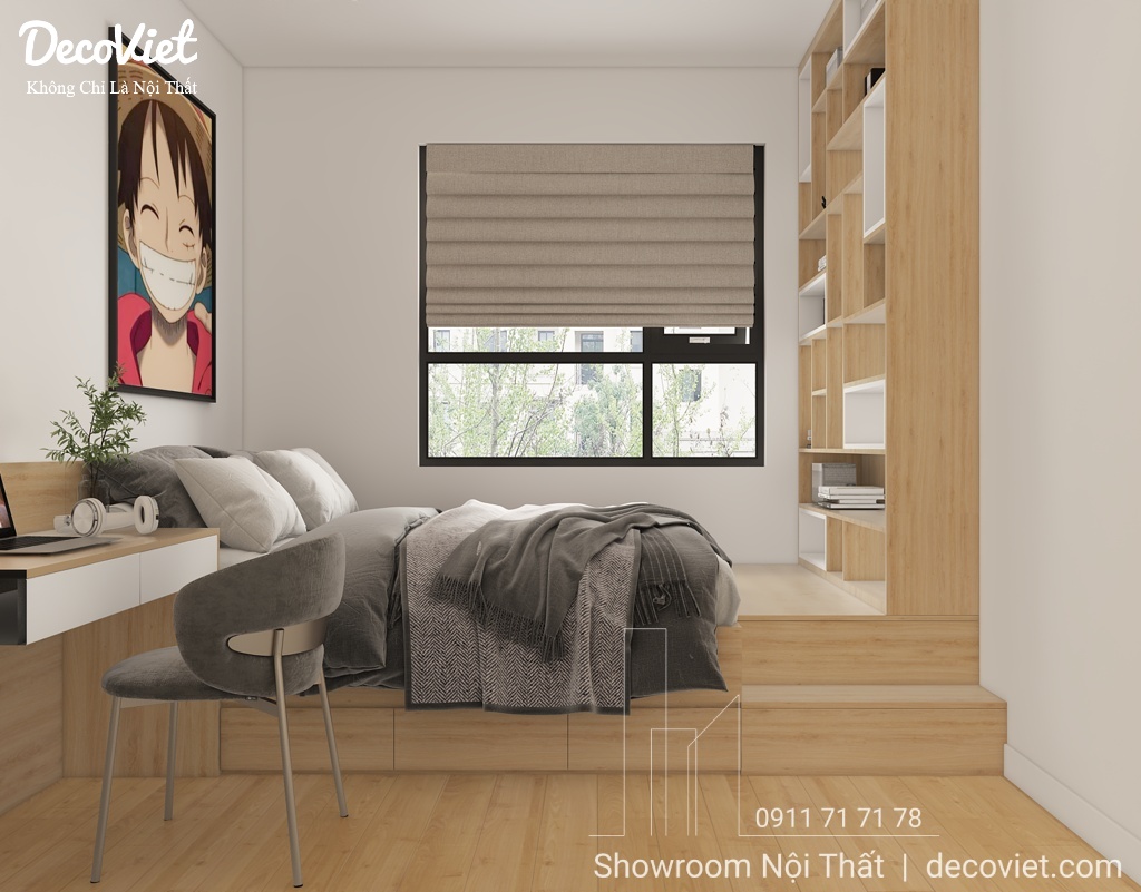 Thiết kế phòng ngủ phụ nhẹ nhàng với nội thất gồm giường ngủ bục kết hợp tủ kệ sách, bàn làm việc, kệ sách và tủ quần áo gỗ công nghiệp cao cấp. Đồng thời, bố trí thêm hệ thống rèm cho ánh sáng phòng được trọn vẹn và đầy đủ hơn.