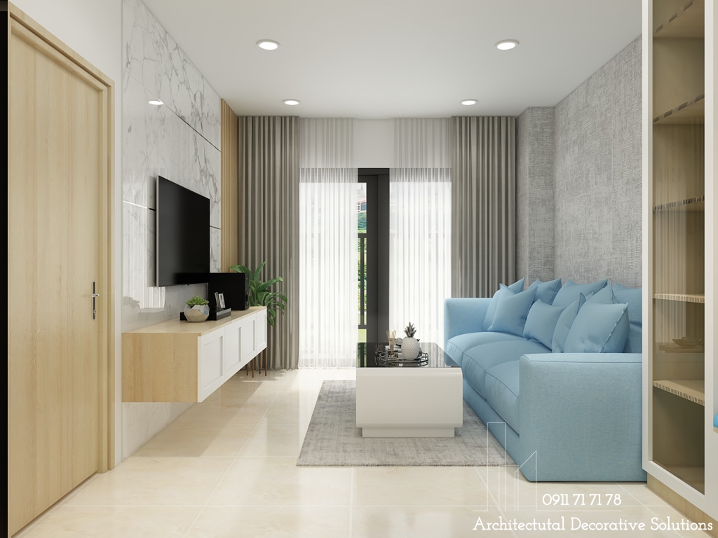 Thiết kế nội thất phòng khách ấn tượng vơi ghế sofa vải màu xanh trời nhẹ nhàng có kiểu dáng hiện đại, sang trọng.