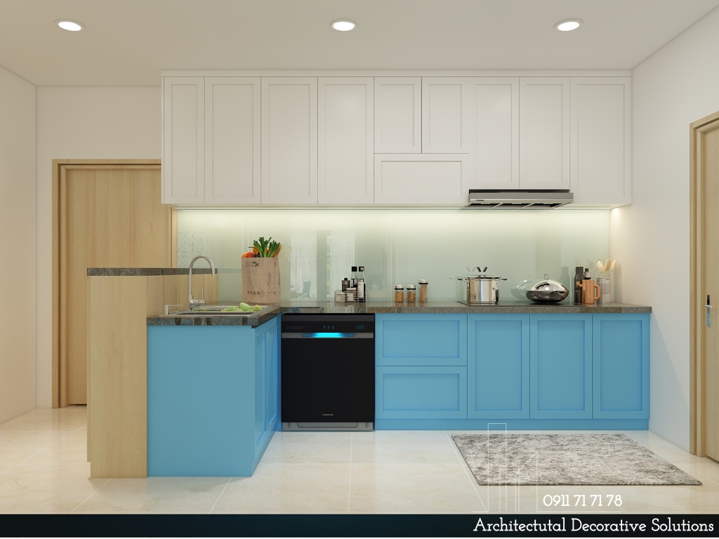 Hệ tủ bếp màu xanh chữ L được bố trí dọc theo chiều dài của tường nhà giúp tiết kiệm tối đa diện tích và cung cấp không gian trữ đồ thoải mái.