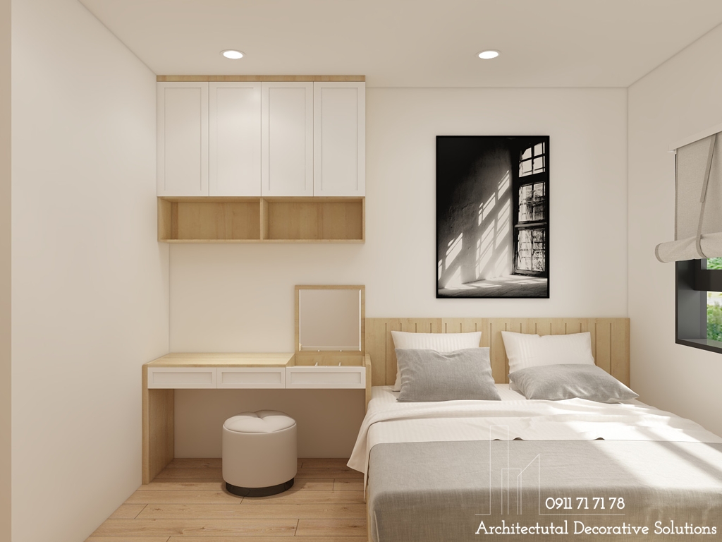 Giường ngủ, bàn trang điểm, kệ trang trí,.. với gam màu trầm của gỗ ấn tượng, màu tường trắng làm nền cho căn phòng.