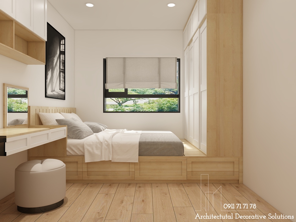 Phòng ngủ sử dụng sàn gỗ cao cấp để tạo cảm giác ấm áp, thân thiện