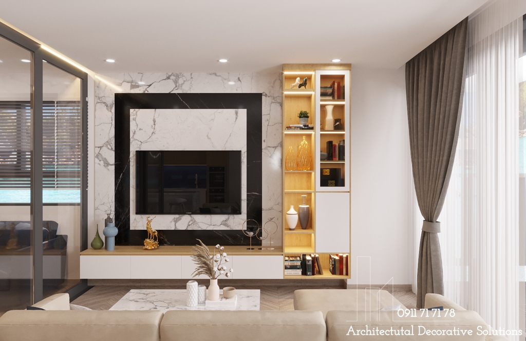 Kệ TV được đặt đối diện với sofa, vừa có tác dụng trang trí, vừa để đặt những món đồ nhỏ xinh, giúp căn phòng thêm sinh động.