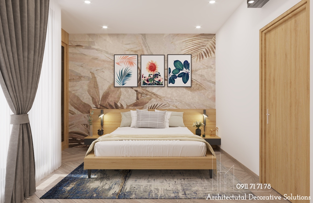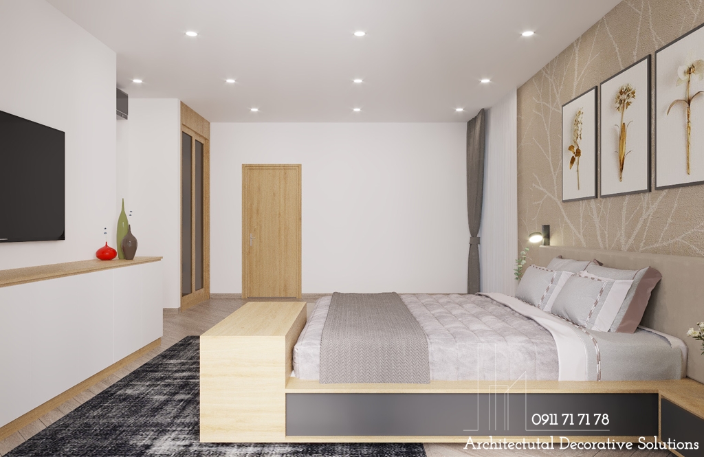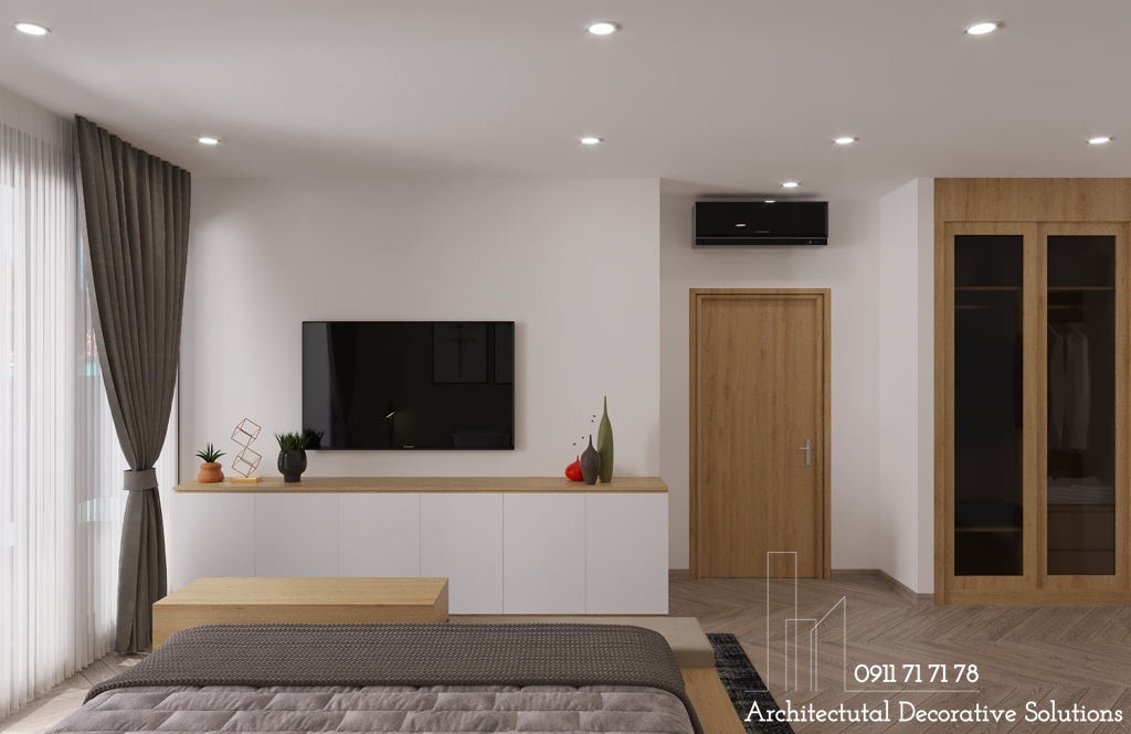 Phòng ngủ thiết kế với đầy đủ nội thất cơ bản như giường ngủ, kệ tivi, tủ quần áo,...