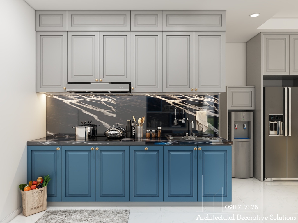 Tủ bếp chữ I hiện đại tối giản với hai gam màu xám và xanh sang trọng. Điểm nhấn màu xanh giúp không gian bếp thêm phần thoáng đãng cho các bà nội trợ khi nấu nướng.