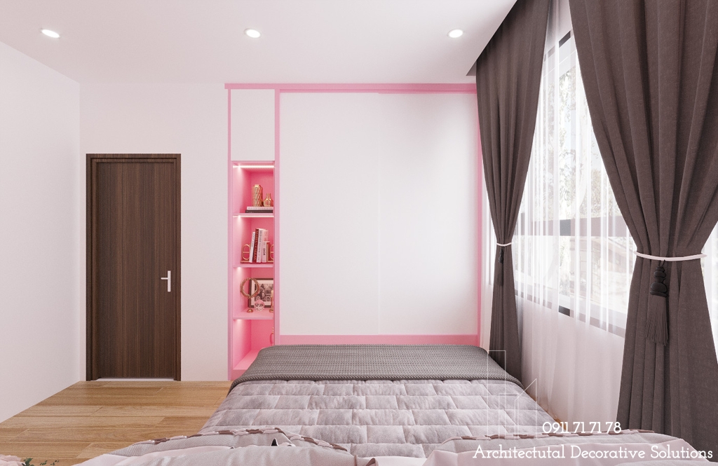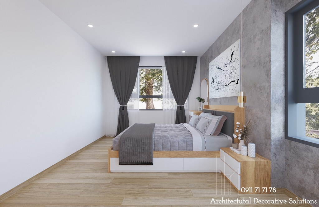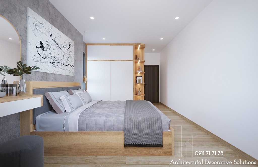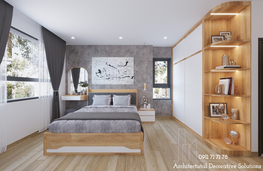 Mẫu phòng ngủ thiết kế hiện đại và tinh tế với màu sắc sang trọng, trang nhã. Không sử dụng đồ nội thất quá cầu kỳ, rườm rà, bố trí đầy đủ nội thất như giường ngủ, tủ quần áo, bàn trang điểm,... phòng ngủ đem lại một không gian hiện đại và sang trọng cho căn phòng thêm sức sống và mới lạ.