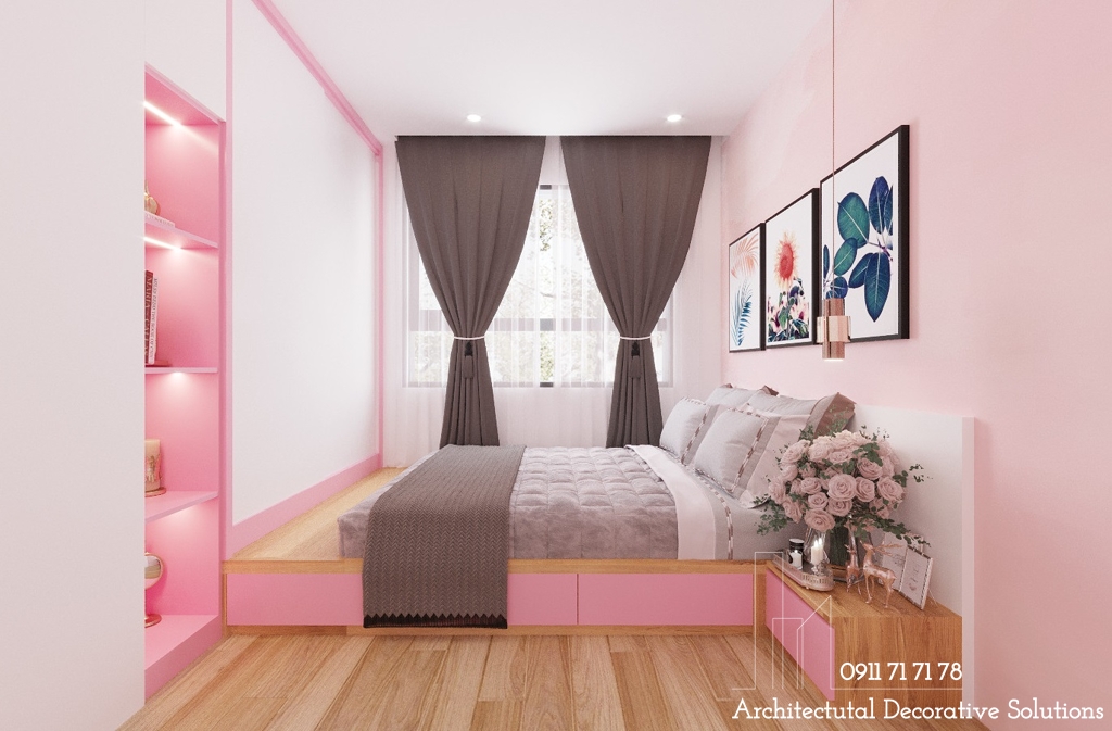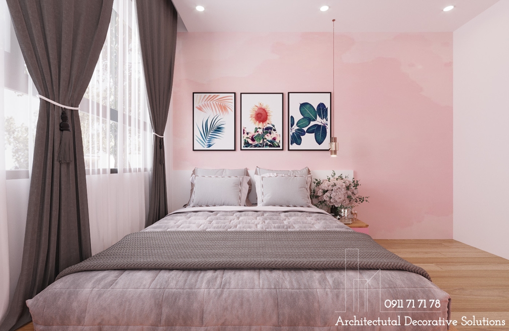 Phòng ngủ 2 trông sáng sủa và thoải mái với gam màu hồng dịu dàng cùng ánh sáng tự nhiên.