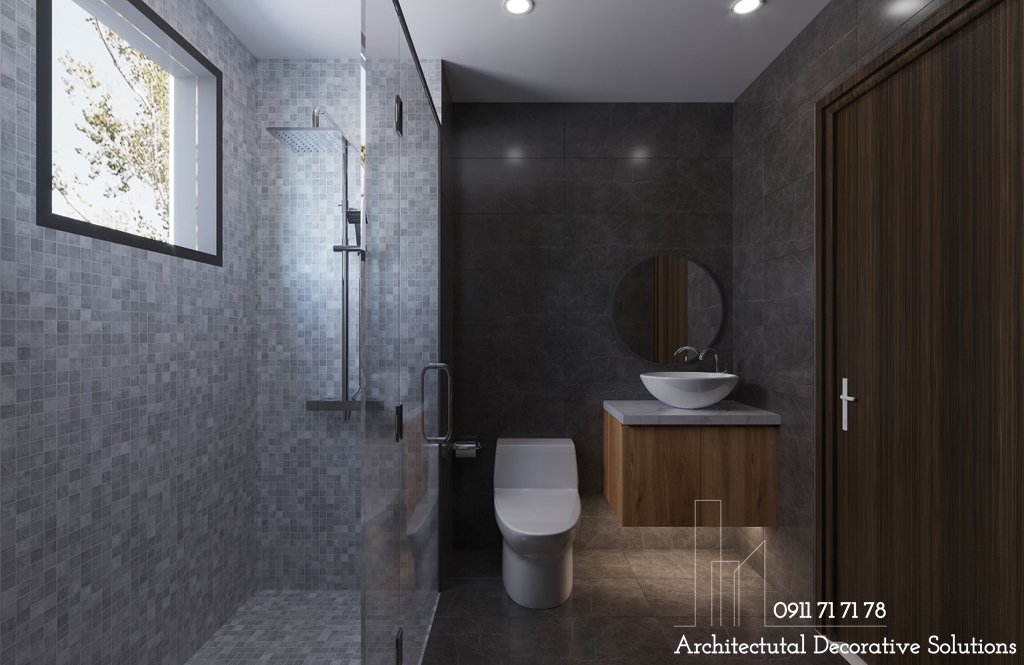 Phòng vệ sinh sang trọng với gạch ốp tường. Gạch gam màu tối vừa sạch sẽ, dễ lau chùi và còn vô cùng hiện đại.