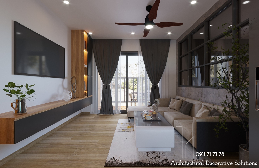 Đối diện sofa là kệ tivi gỗ treo tường hiện đại. Kệ tivi đơn giản với thiết kế kết hợp tủ lưu trữ tiện lợi. Phòng khách căn hộ thêm phần sang trọng với đồ nội thất trang trí hiện đại.