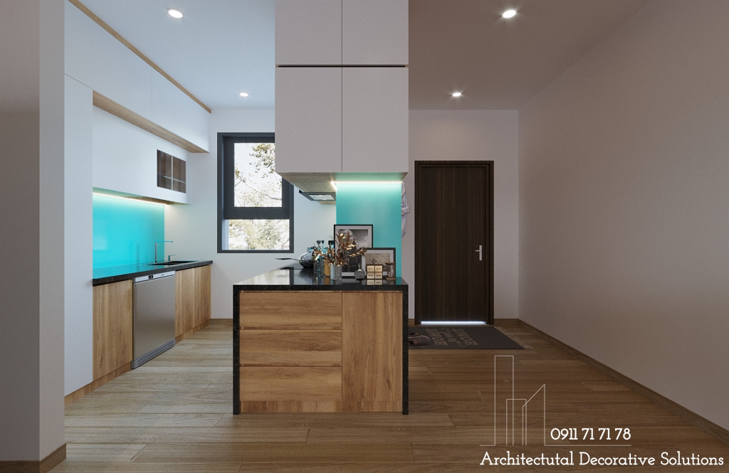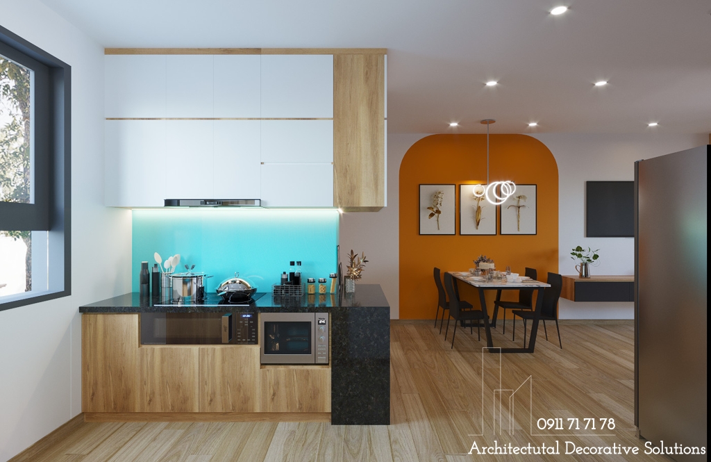 Tủ bếp thiết kế nhỏ gọn, màu sắc chủ đạo căn bếp là màu tự nhiên của nội thất gỗ. Các màu sắc kết hợp hài hòa với nhau tạo cảm giác hiện đại, tiện nghi và rộng rãi cho căn bếp căn hộ chung cư nhỏ. Khu vực bàn ăn sang trọng với bộ bàn ăn 4 ghế chân sắt mặt đá cao cấp, điểm nhấn là bộ tranh treo tường và đèn trang trí tất cả tạo nên một không gian vô cùng hiện đại sang trọng.