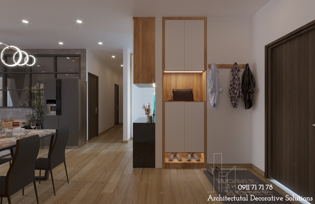 Tại cửa ra vào được bố trí tủ để giày dép với màu trắng mang lại không gian cho sự thông thoáng. Tủ giày được thiết kế cao đụng trần có nhiều ngăn khác nhau. Ngoài để giày đép, có thể để thêm nhiều đồ như áo mưa, mũ bảo hiểm,…