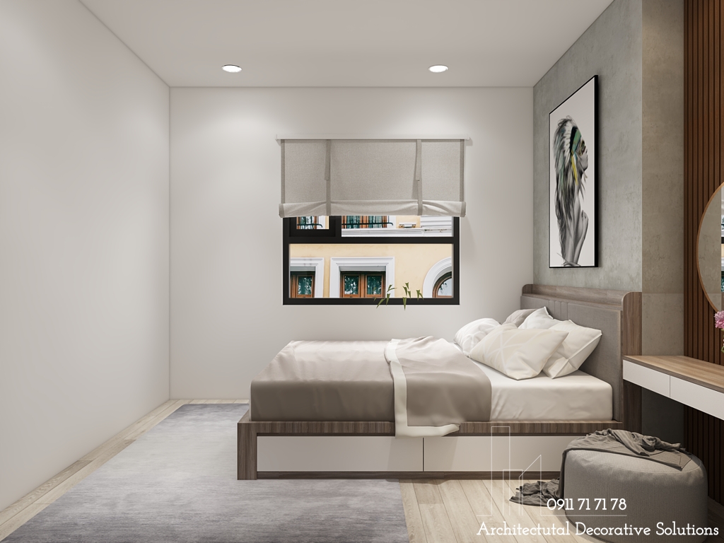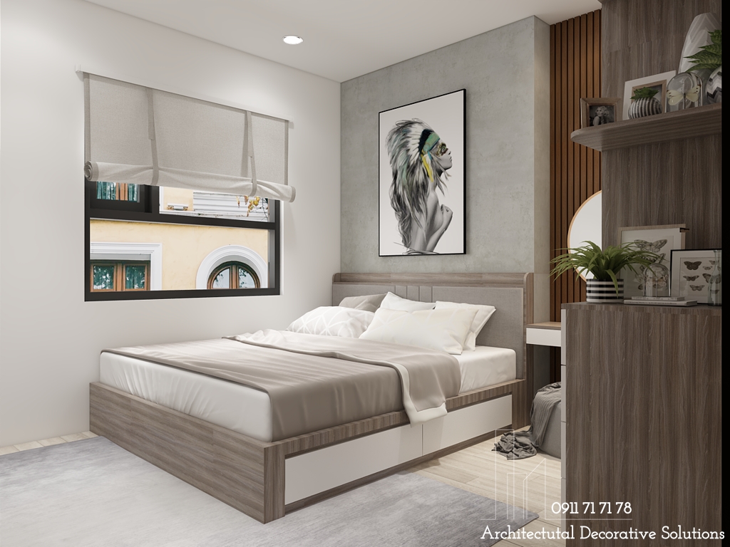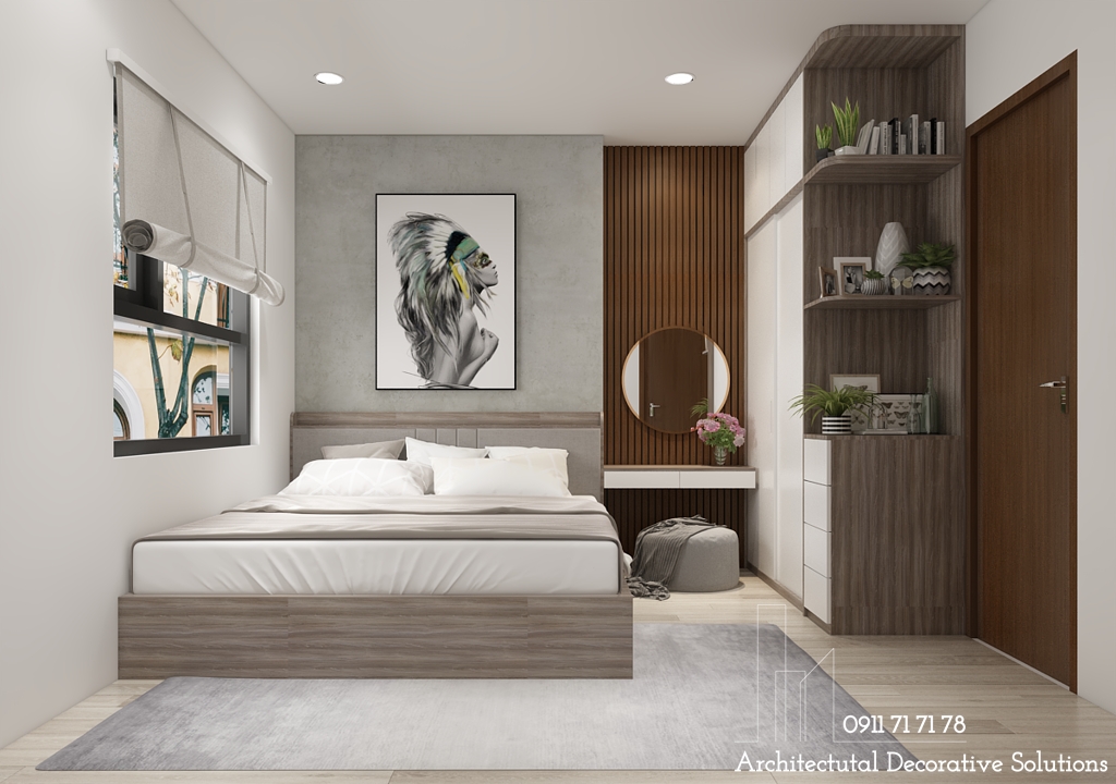 Mẫu nội thất phòng ngủ master đơn giản bao gồm giường ngủ đôi, tủ quần áo cạnh giường ngủ kế bên bàn trang điểm được sắp xếp hợp lý và khoa học.