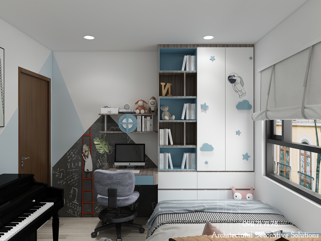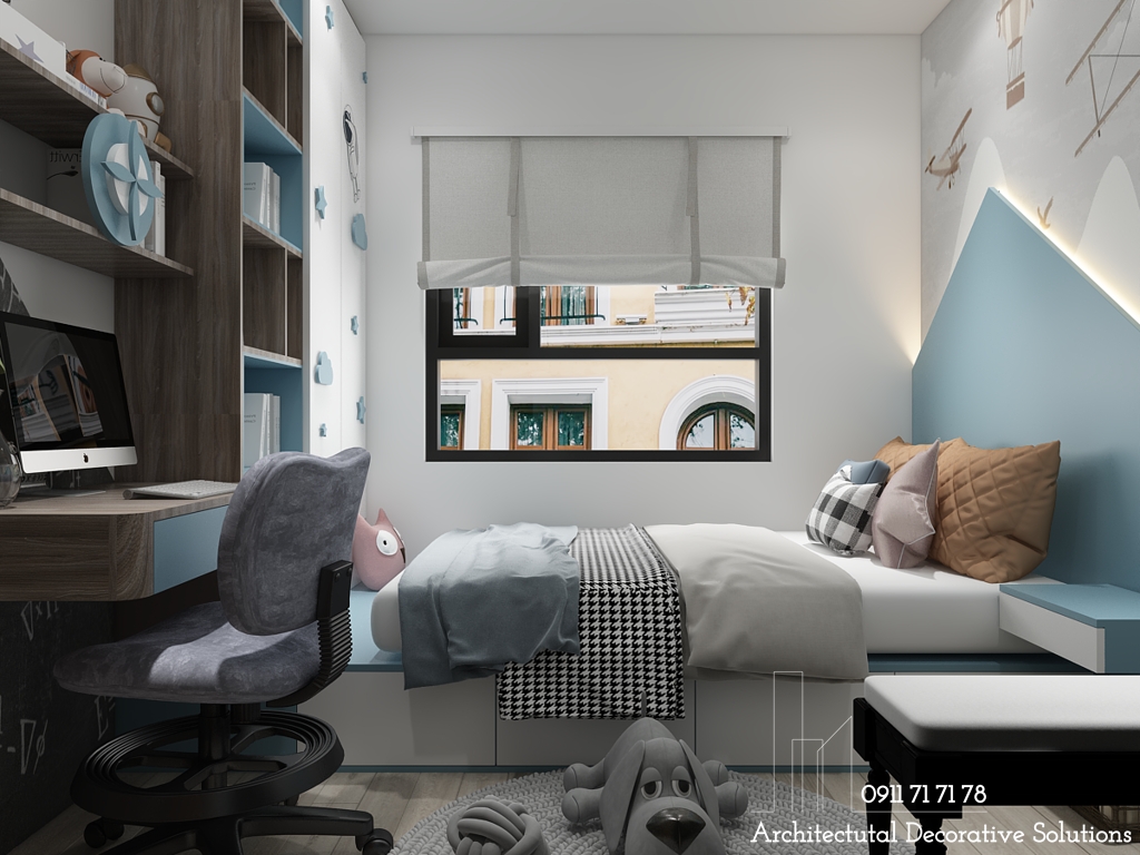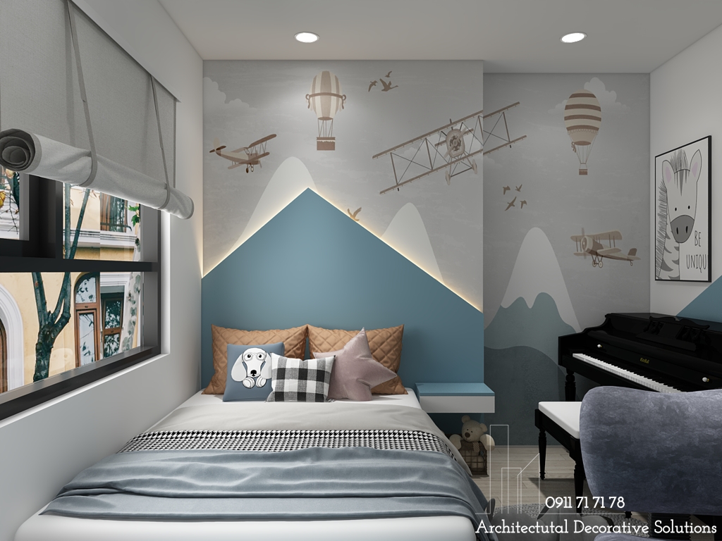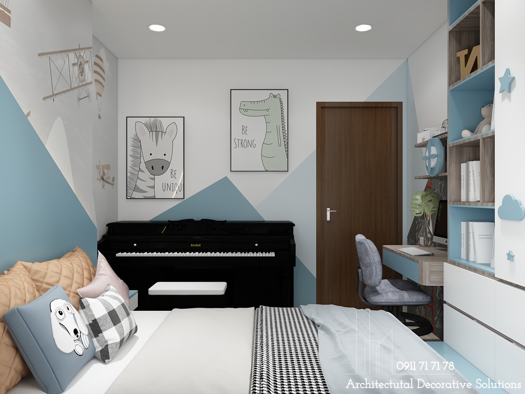 Căn phòng ngủ dành cho trẻ em, bé từ 5-10 tuổi, ý tưởng được đưa ra với tông màu xanh năng động, bộ chăn trải giường với tông màu xanh trắng, điểm vào đó là màu vàng của chiếc gối và bức tường trang trí. Thể hiện sự ngây thơ, trog sáng của bé ...như chính tâm hồn của các bé.