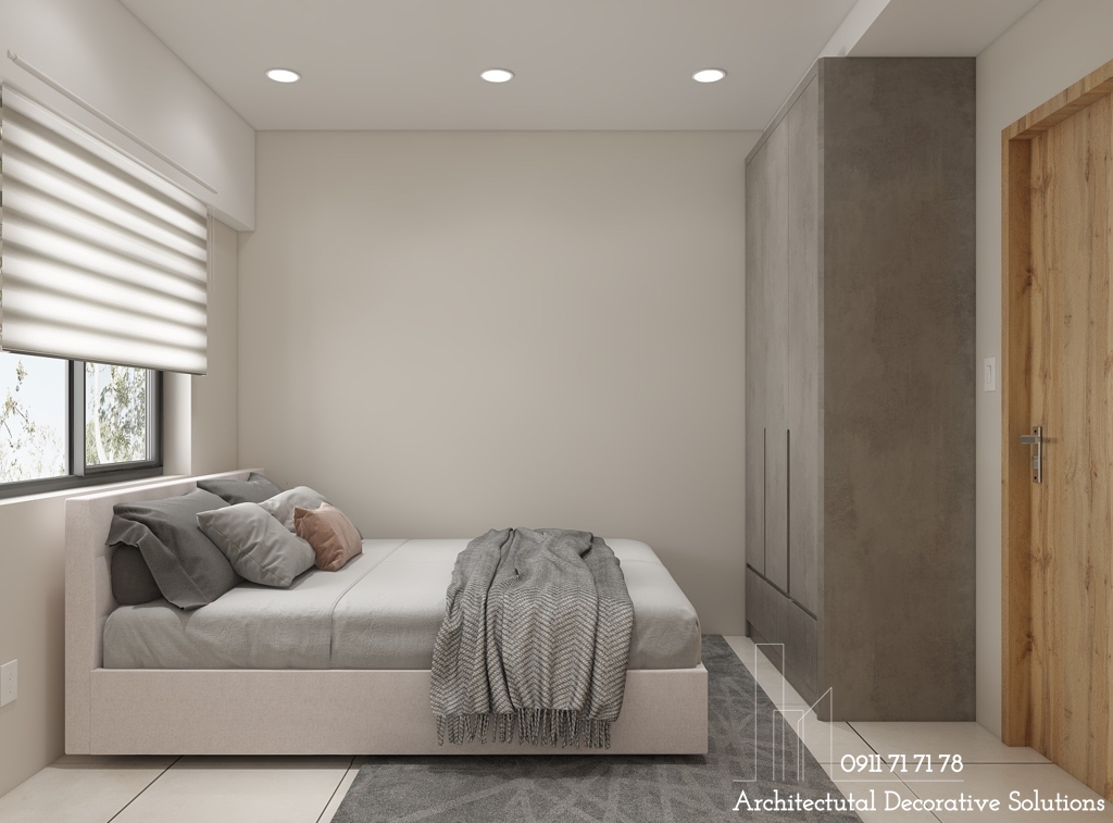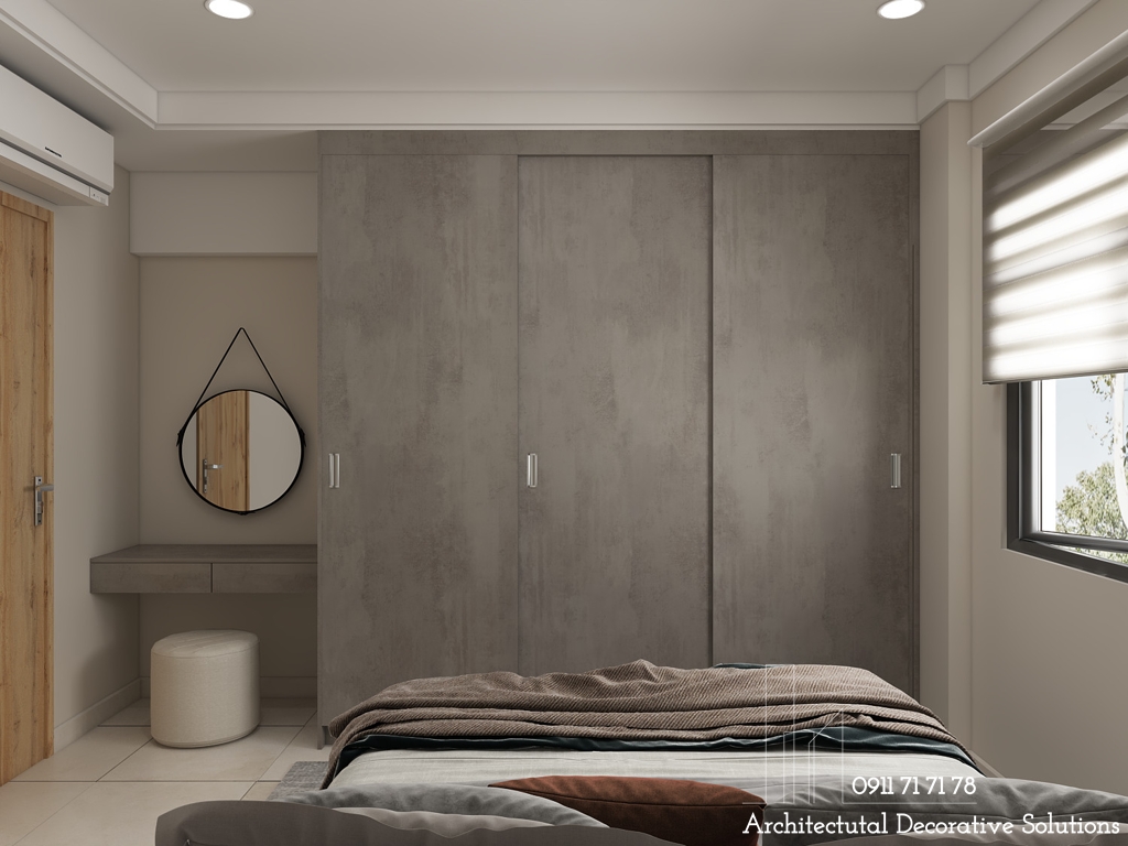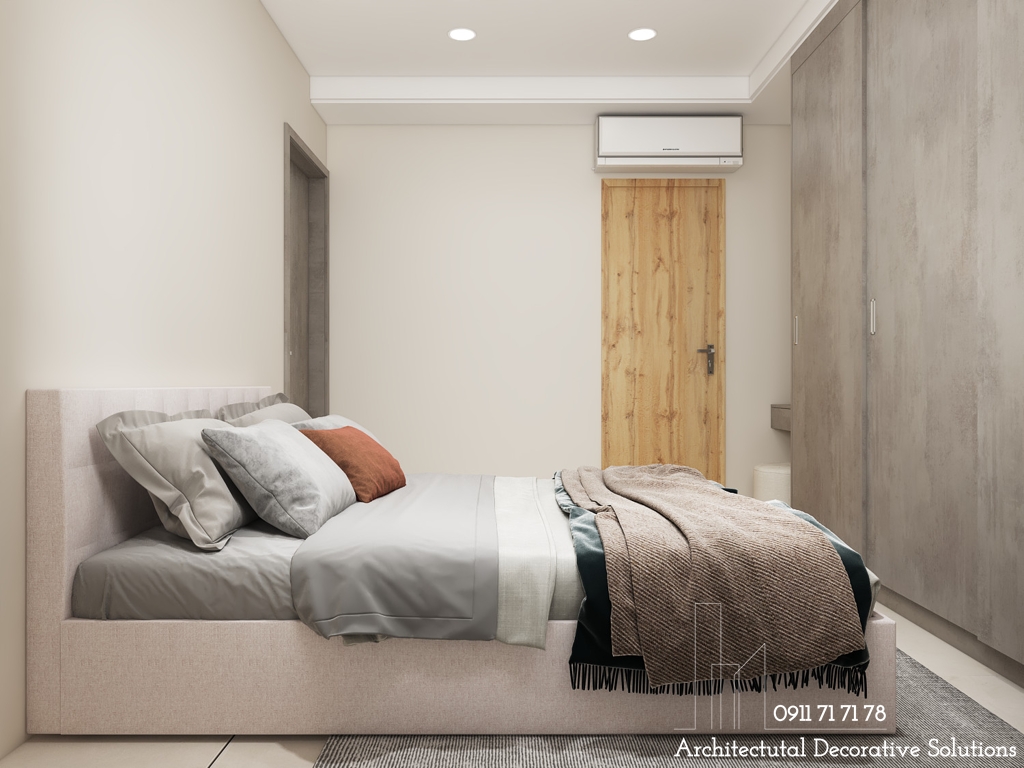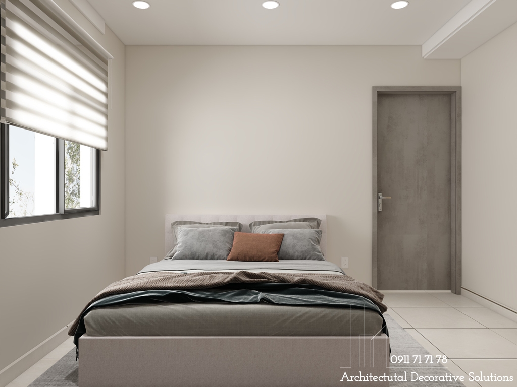 Mẫu phòng ngủ thiết kế hiện đại và tinh tế với màu sắc sang trọng, trang nhã. Không sử dụng đồ nội thất quá cầu kỳ, rườm rà, bố trí đầy đủ nội thất như giường ngủ, tủ quần áo, bàn trang điểm,... phòng ngủ đem lại một không gian hiện đại và sang trọng cho căn phòng thêm sức sống và mới lạ.