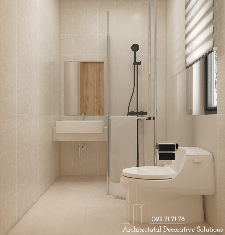 Phòng vệ sinh sang trọng với gạch ốp tường. Gạch màu xám vừa sạch sẽ, dễ lau chùi và còn vô cùng hiện đại.