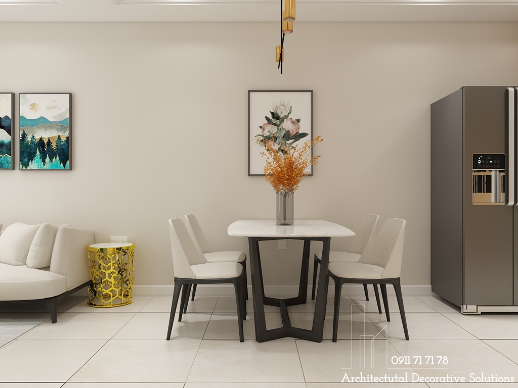 Tủ bếp thiết kế hình chữ L, màu sắc chủ đạo căn bếp là những gam màu trung tính.Các màu sắc kết hợp hài hòa với nhau tạo cảm giác hiện đại, tiện nghi và rộng rãi cho căn bếp căn hộ chung cư nhỏ. Khu vực bàn ăn sang trọng với bộ bàn ăn 4 ghế chân gỗ mặt đá cao cấp, điểm nhấn là bức tranh treo tường và đèn trang trí tất cả tạo nên một không gian vô cùng hiện đại sang trọng.