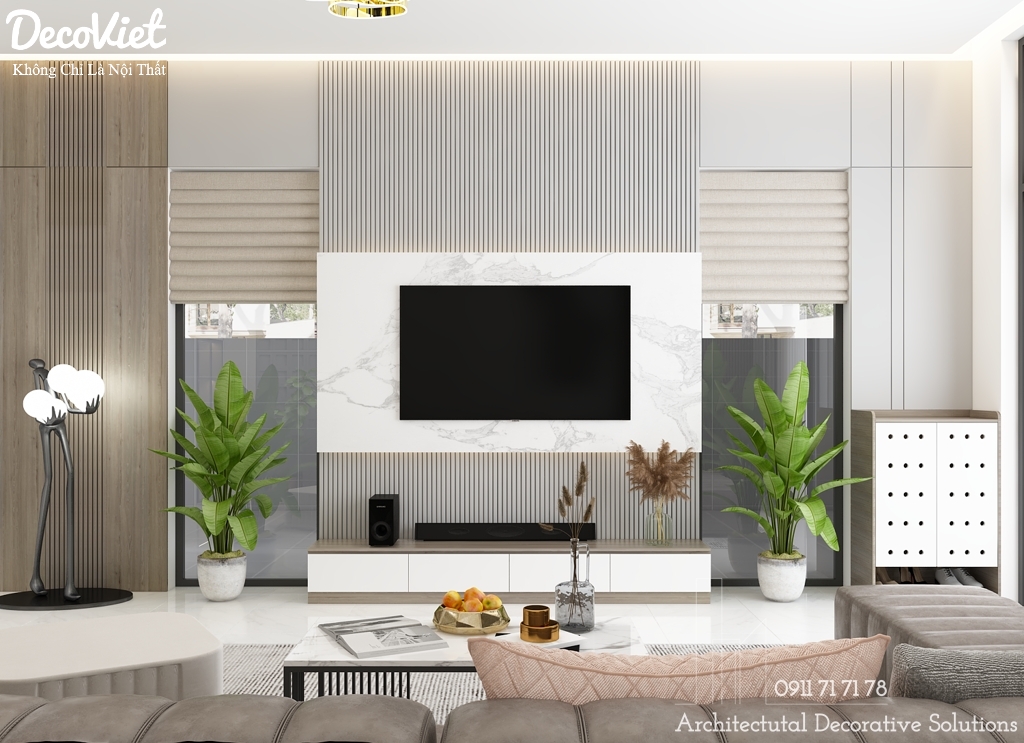 Kệ tivi với kích thước phù hợp giúp không gian trở nên rộng rãi và có nét thẩm mỹ hơn. Sử dụng nội thất trang trí tạo điểm nhấn nổi bật cho phòng khách.