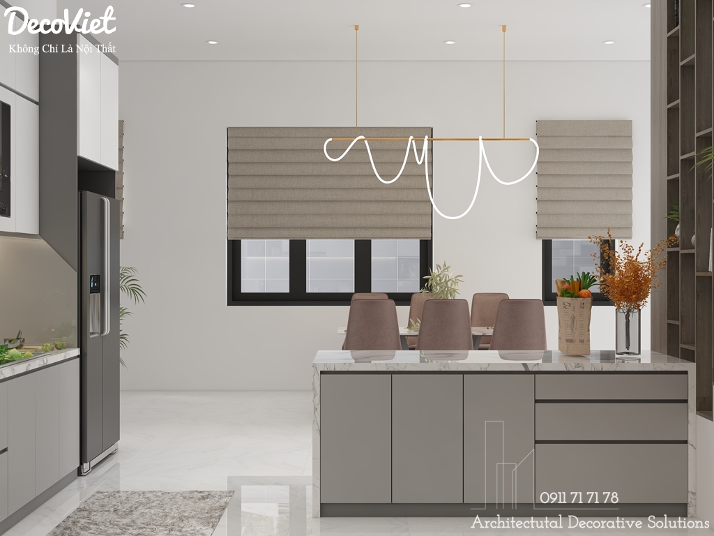 Phòng bếp tiện nghi hiện đại với nội thất cao cấp. Sử dụng thêm đèn thả bàn phòng ăn mang lại cảm giác ấm cúng gần gũi.
