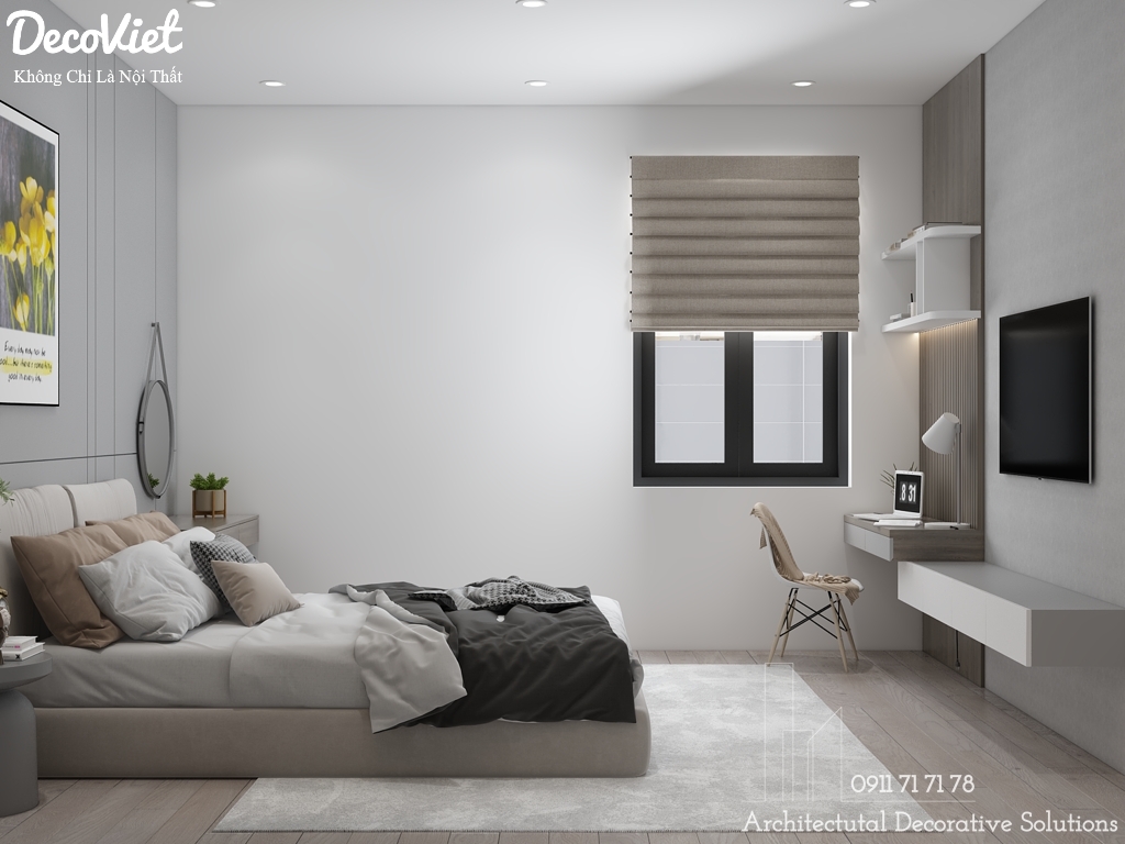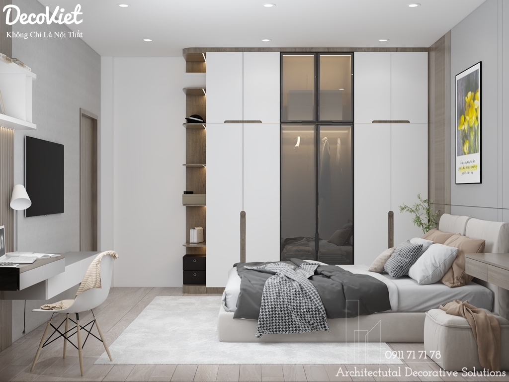 Phòng ngủ master hiện đại với đầy đủ nội thất: Giường ngủ, tủ quần áo, tab đầu giường, kệ tivi, bàn trang điểm, bàn làm việc,...