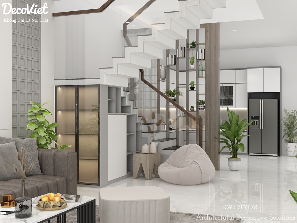 Thiết kế tủ kệ trang trí dưới gầm cầu thang tăng thêm tính thẩm mỹ cho phòng khách